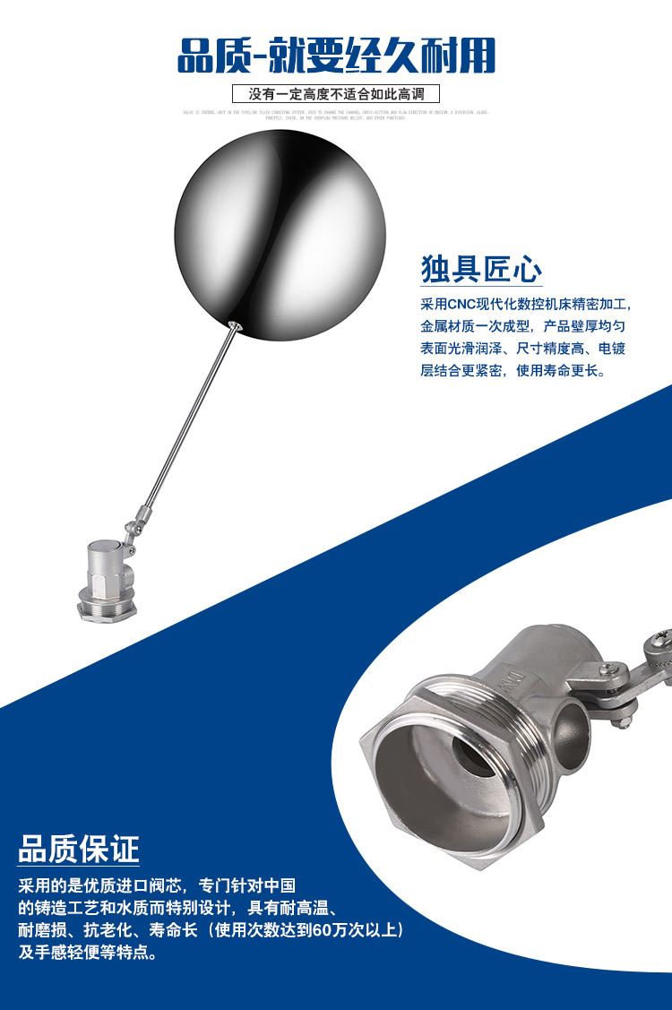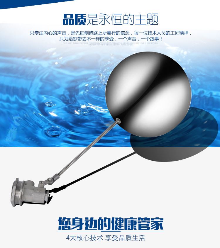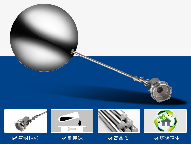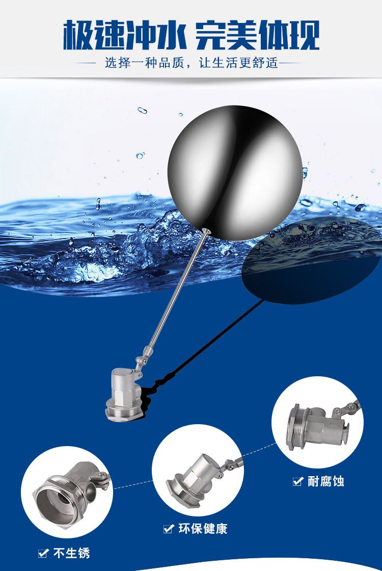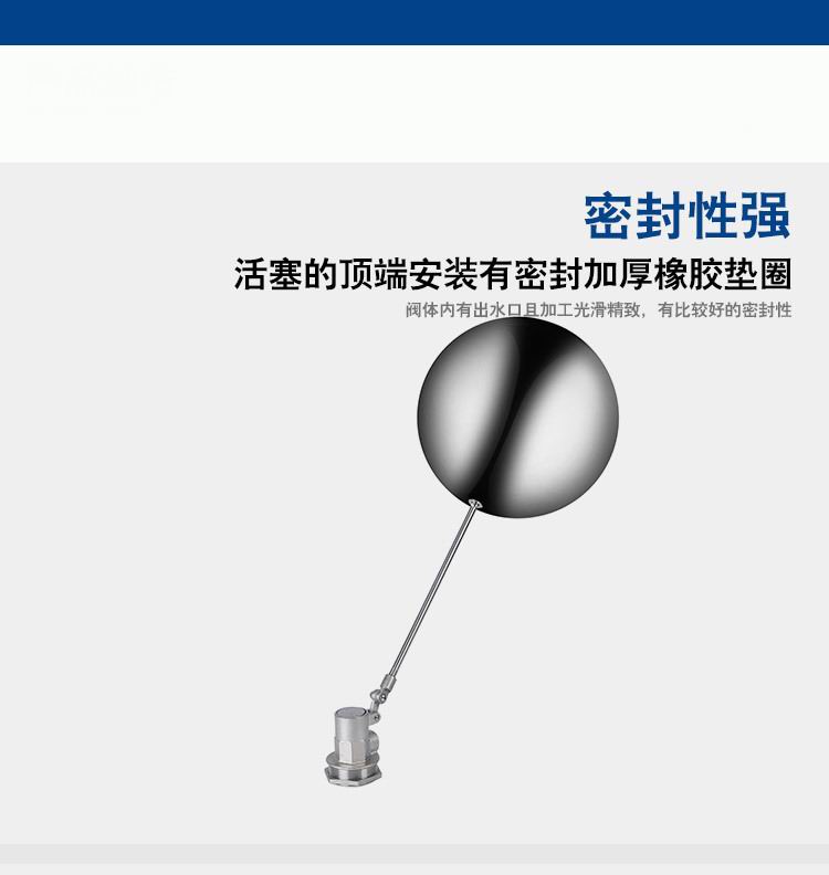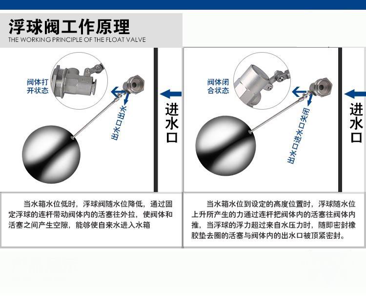 當(dāng)水塔內(nèi)水面下降時(shí),浮球下落,利用水管內(nèi)水的壓力,將閥體里的密封硅膠柱塞打開,閥體開啟供水,當(dāng)水塔水位上升時(shí),浮球上浮,連桿帶動(dòng)柱塞,硅膠體密封進(jìn)水孔,閥體停止供水.