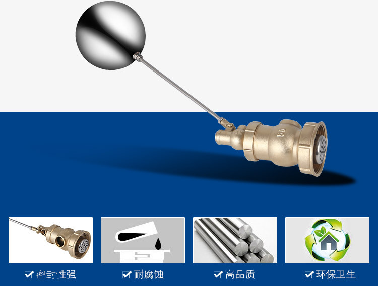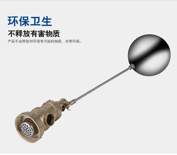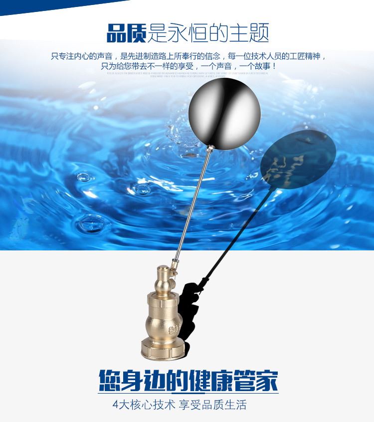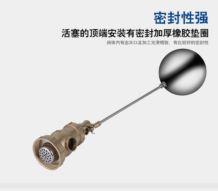 當水塔內水面下降時,浮球下落,利用水管內水的壓力,將閥體里的密封硅膠柱塞打開,閥體開啟供水,當水塔水位上升時,浮球上浮,連桿帶動柱塞,硅膠體密封進水孔,閥體停止供水.