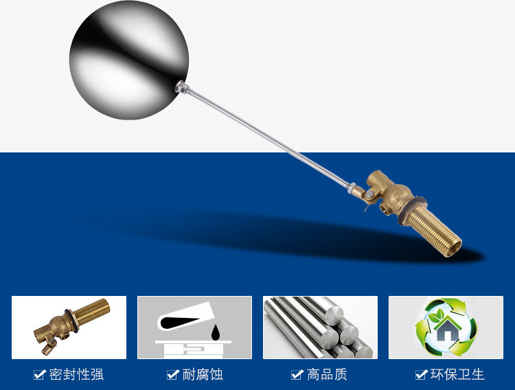 當(dāng)水塔內(nèi)水面下降時(shí),浮球下落,利用水管內(nèi)水的壓力,將閥體里的密封硅膠柱塞打開,閥體開啟供水,當(dāng)水塔水位上升時(shí),浮球上浮,連桿帶動(dòng)柱塞,硅膠體密封進(jìn)水孔,閥體停止供水.