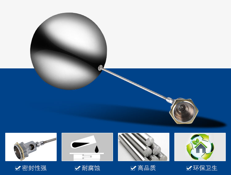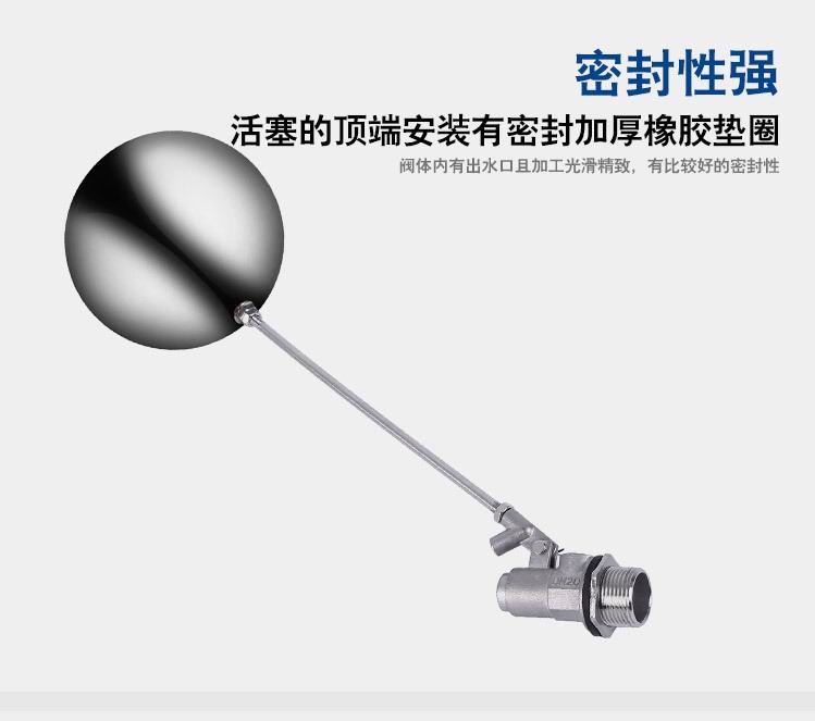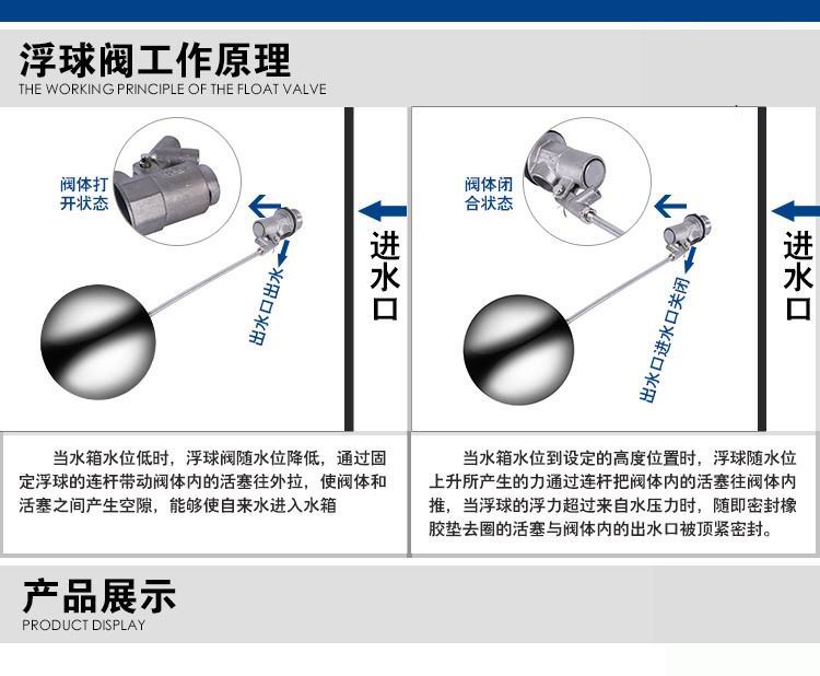 當水塔內(nèi)水面下降時,浮球下落,利用水管內(nèi)水的壓力,將閥體里的密封硅膠柱塞打開,閥體開啟供水,當水塔水位上升時,浮球上浮,連桿帶動柱塞,硅膠體密封進水孔,閥體停止供水.