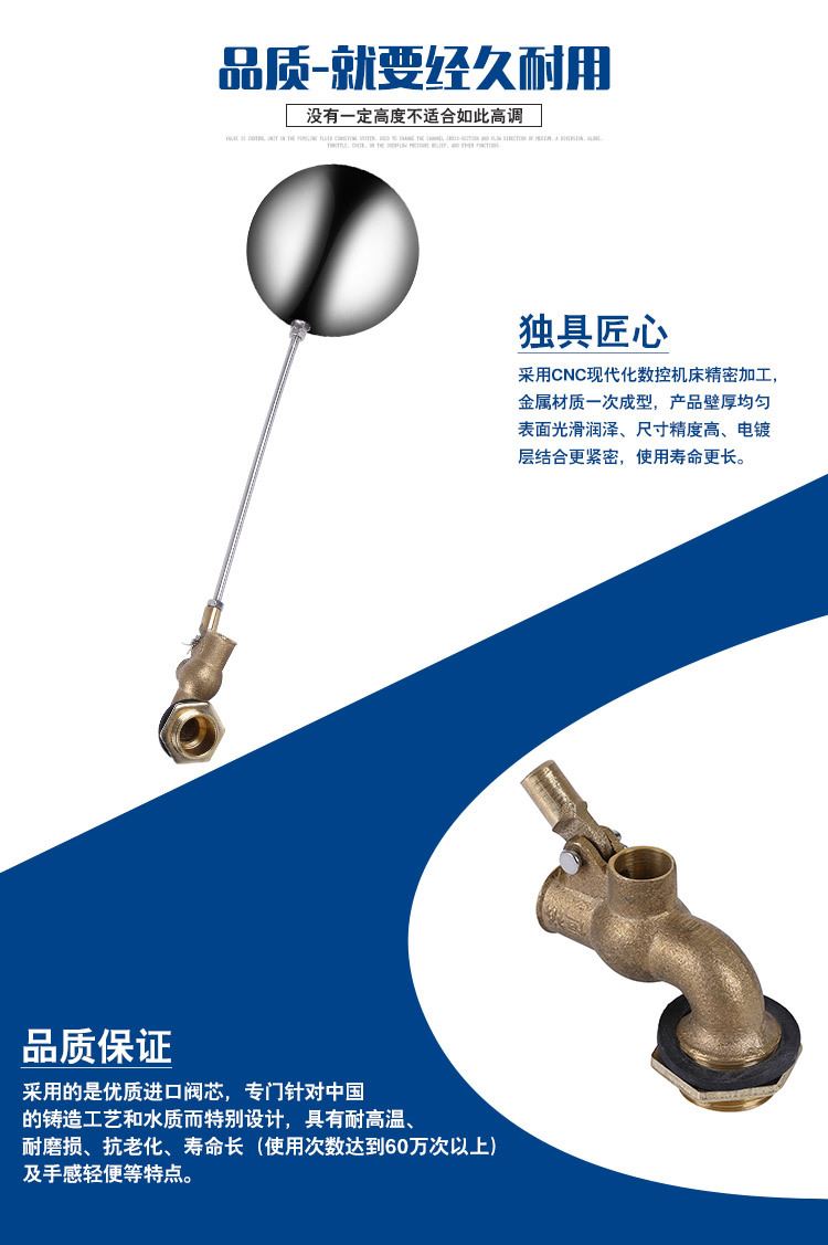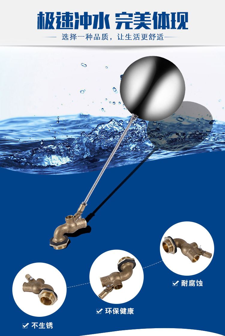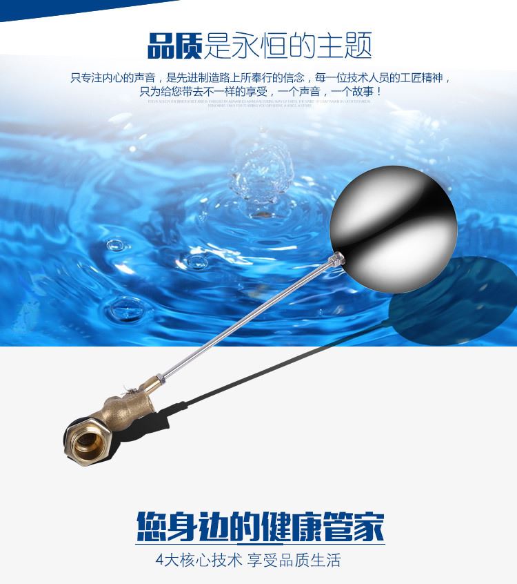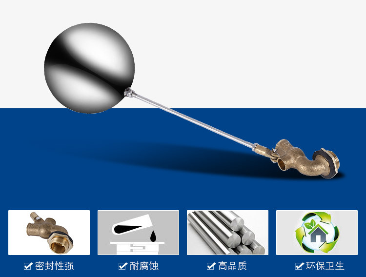 當(dāng)水塔內(nèi)水面下降時,浮球下落,利用水管內(nèi)水的壓力,將閥體里的密封硅膠柱塞打開,閥體開啟供水,當(dāng)水塔水位上升時,浮球上浮,連桿帶動柱塞,硅膠體密封進(jìn)水孔,閥體停止供水.